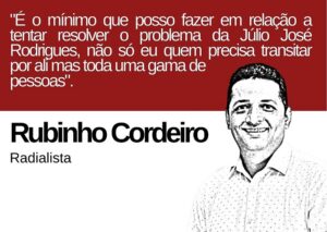 Além de discutir a situação de nossa Bahia, o radialista tem focado em cobranças de melhorias para a cidade e a região de Itapetinga. Na última terça-feira, 20, Rubinho, em entrevista ao ex-prefeito da cidade de Serrinha e atual deputado estadual Osni Cardoso (PT), não deixou de mencionar os atuais problemas da Avenida Júlio José Rodrigues, compreendendo o trecho que vai da ponte da rodoviária até a saída da Azaleia.