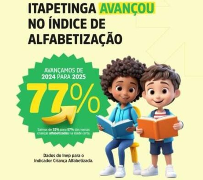 A educação de Itapetinga alcançou um marco histórico ao registrar crescimento de 77% no indicador “Criança Alfabetizada”, resultado que evidencia o avanço da rede municipal de ensino e reforça o compromisso da atual gestão com a alfabetização na idade certa.